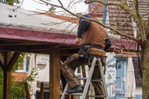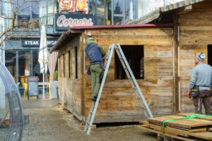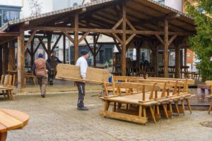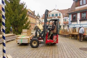 Fünf Mitarbeiter des Zeltvermieters „Hütten- und Barverleih Holzblockmacher“ begannen routiniert mit dem Rückbau der Almhütte. Schritt für Schritt wurde die Konstruktion zerlegt – nach rund drei Stunden war vom Hüttenzauber bereits nicht mehr viel zu sehen.